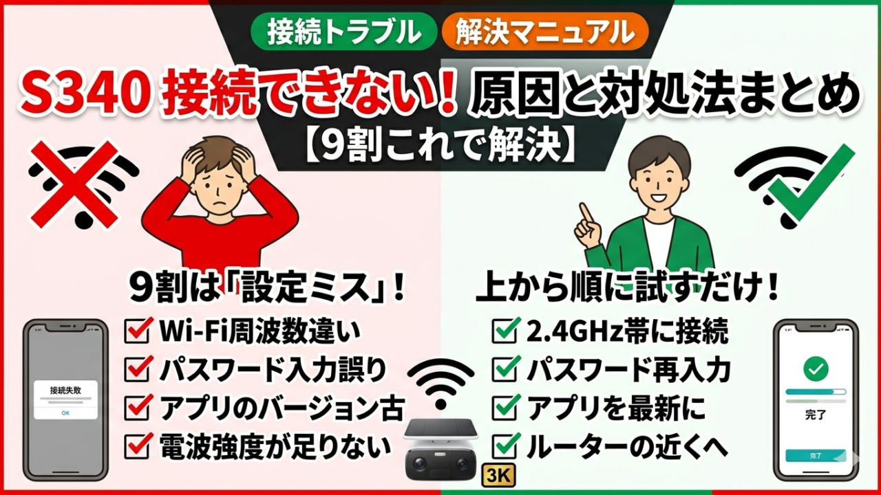 まずは「2.4GHzに切り替え」「ルーター再起動」「アプリ再インストール」の3つを順番に試してください。